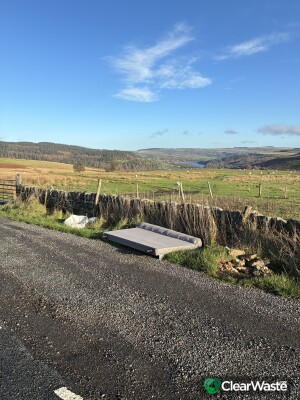 A piece of furniture possibly a bed head in a small roadside pull in but not the biggest pull in. There is also a bag of household rubbish in a separate spot near the Sugworth Road junction. Thank you