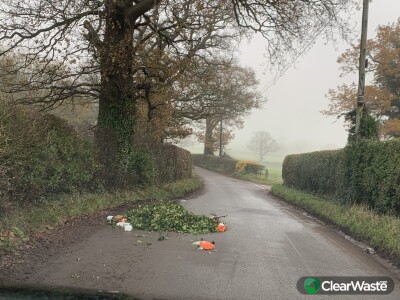 Garden waste and other rubbish dumped in the middle of the lane blocking a pull in