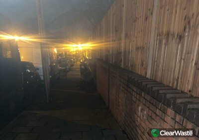 Dumped black bags, a discarded metal rotary washing line, a broken chair dumped on public pavement. Blocking path for passersby