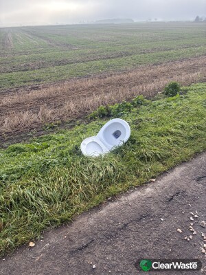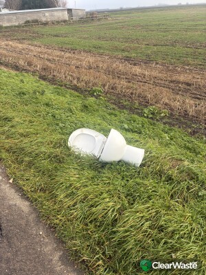 Old dirty toilet on grass verge , on Thorpe bank a little before cross roads