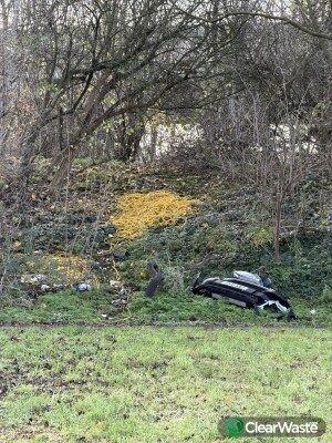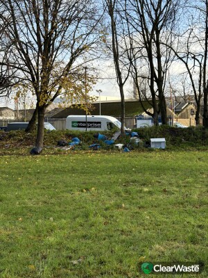 Large amount of various waste has been dumped around boundary of park. Car bumper, numerous blue plastic bags, refrigerator, tyres and plastic cabling.