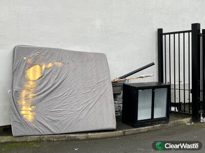 Again outside Woodlows house Mattress Fridge , Metal trolley and rubbish