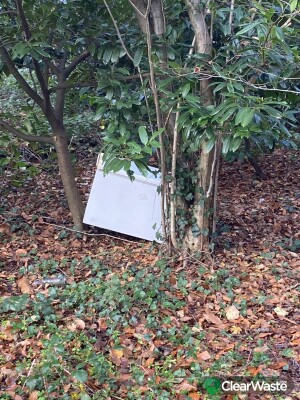 Fridge adjacent to footpath through woodland between woods edge and holly drove