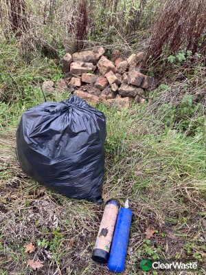 Brick Rubble. Opposite the garages of Walnut Tree Cottages. Also gas canisters that I picked out of the ditches and a black back with other waste thrown out of vehicle windows.
