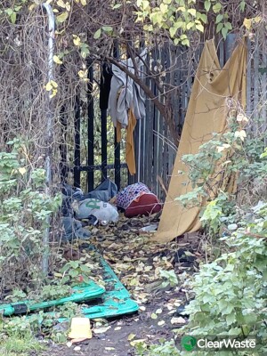 Household waste, clothes, blankets, general rubbish, some electrical bits. Just under the railway bridge in the hedgeway often used as a place where drug deals are done