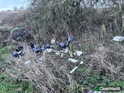 Glass and broken tile shards (dangerous), what looks like old kitchen or bathroom parts and hazardous chemicals in plastic bags