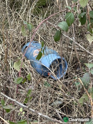 Abandoned weelie bin, empty gas cylinder and assorted litter