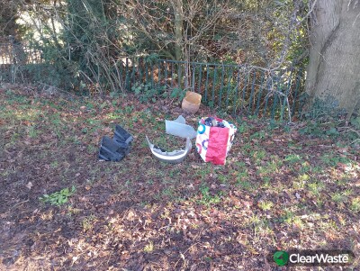 In Whinfield recreation ground car park, fly tipping on the grass between the carpark and the cemetery. Thank you.