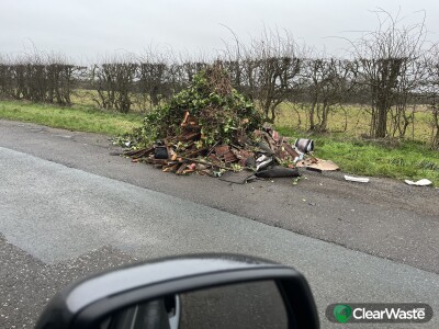 Driving East on Manton lane found a full load of conifer cut offs on verge. Obviously a pick-up truck with a tipper as is evident the way the load piled up