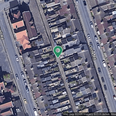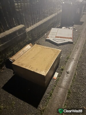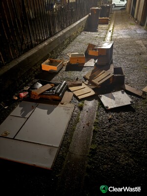 Broken wooden cupboards, part of office chair and large cardboard box. In the lane behind lorne road
