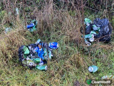 Two large dumps of beer cans at OrdnaySurvey location ST65546 18151. On the verges in a gateway beside the road plus along road edges. Along road from A30 towards Milborne Wick.
