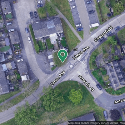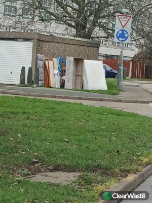 On rounndabout at junctio of Limes Avenue and Amanda Close..4 mattresses.piping .largecupboard.dumped chairs and other rubbish