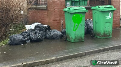 Extra waste left on side of bins even when bins get emptied the waste is left behide and the owner of the bins only takes the empty bins bk inside