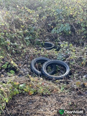 5 motorcycle tyres dumped to the right of the gate