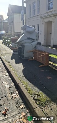 Sofa chairs, table, chairs outside propert been there ove a week block the pavement