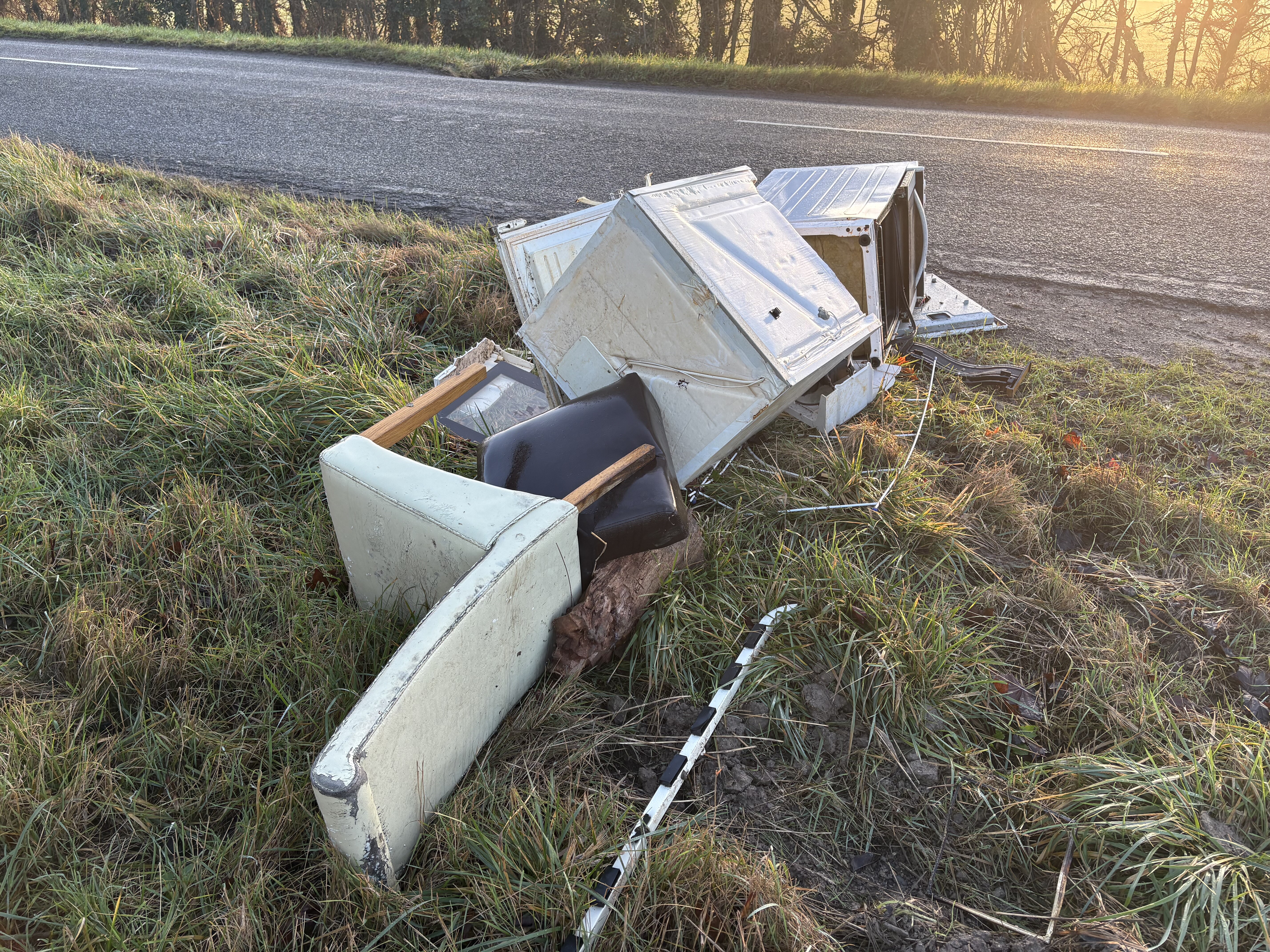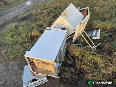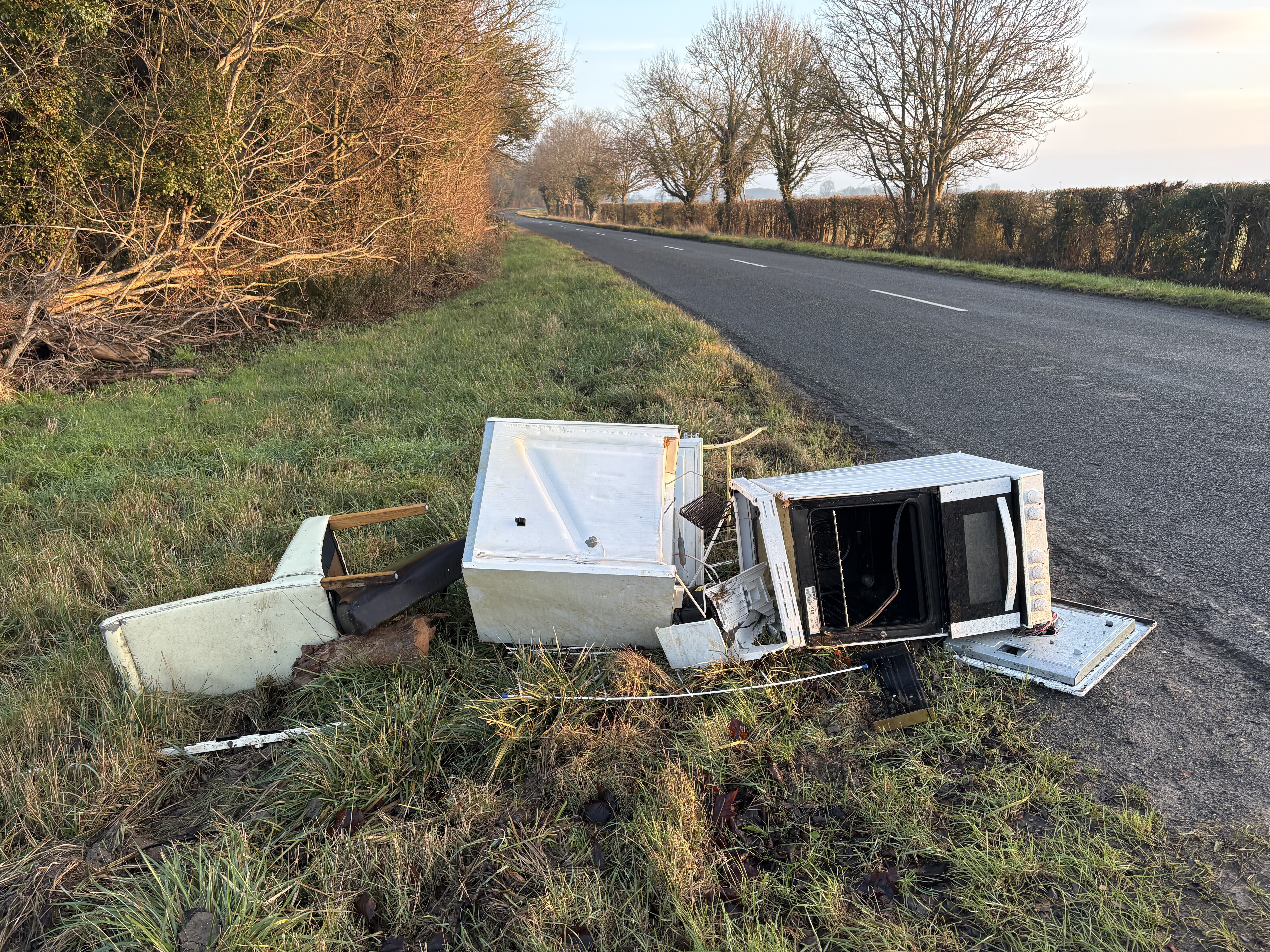 Broken white goods and a chair left by side of road near farm track between Fowlmere and Newton
