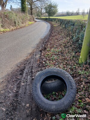Tyres on verge near gateway stacked and ready