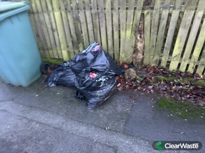 Household rubbish on path been there since Christmas by green recycle bin and wooden fence on Long field ave