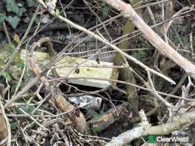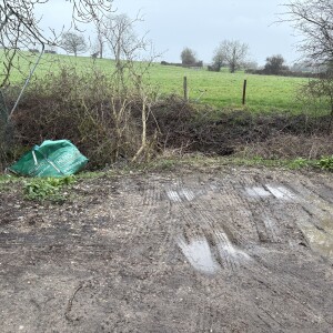 Fly tipping all along this lane has been covered by the hedges that were cut back chemicals are in the stream