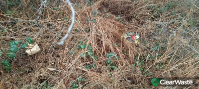 I think this is public property. Behind green fence, just to the left of the public bin when you are facing it. Looks like mainly fast food packaging.