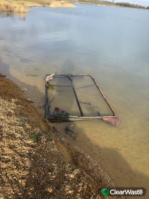 Appears to be wooden window frame dumped into the reservoir near Buckden Road, A14, and A1. Pieces of plastic covering are coming off and floating in the water near where the ducks and swans are often found.