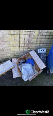 Stereo audio devices, wires, plastic bag and cardboard paper left on the floor for weeks at the Council allocated waste collection spot next to the bins. Behind the wall of Carnaby Avenue 5, Bridlington.
