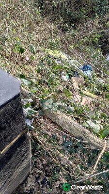 In rough ground adjacent to the waste bin at the layby. Various bags, metal frame, cardboard