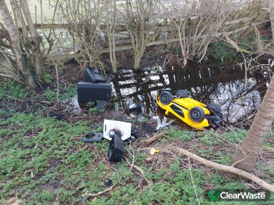 Speakers and toy car. At back of layby. W3W: deeply.agents.bland