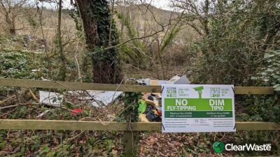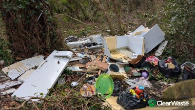 Large pile of waste including a large, broken- up fridge, interior doors, children's toys, lamp etc etc. There is also a heap of black bin bags slight further from the lane, all just by the (No tipping, CCTV in operation" sign!