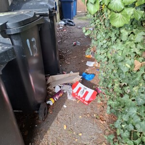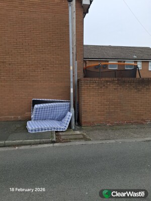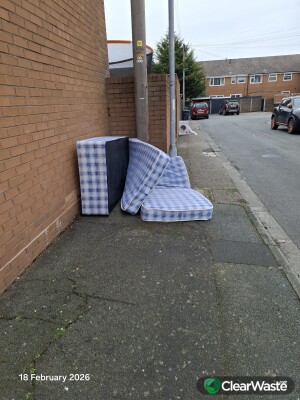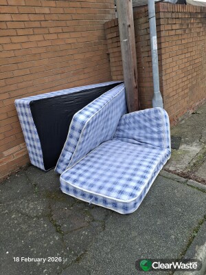 Mattress and bed tipped by residents of flats that show a trampoline in the image.