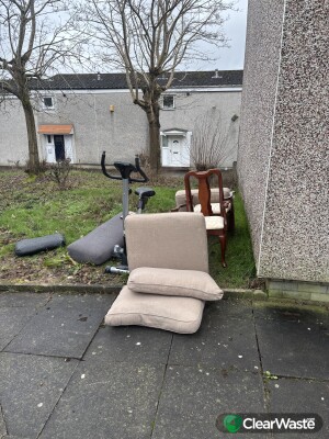 Old chairs, cushions and exercise bike dumped by tramps!!!