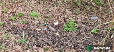 Various bottles, cans rubbish and a large plastic container