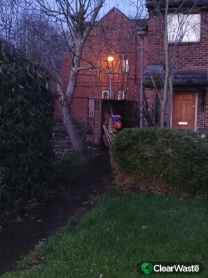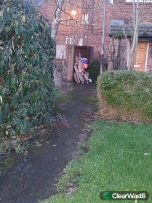 Found on the left of 1 Amanda Close.chigwell on a public pathway .what seems to be several planks of wood and possible discarded toy of some kind..