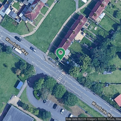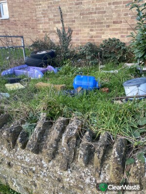 Opposite the school and next to the zebra crossing. Lots of litter and discarded items