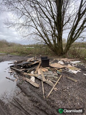 A truckload of old bits of fencing under a chair dumped on this muddy truck next to the Manchester ship Canal. Thank you.