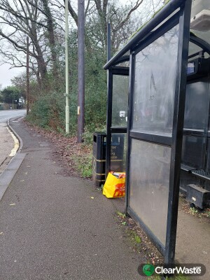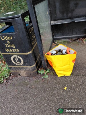 Carrier bag full of empty glass bottles dumped by bus shelter.