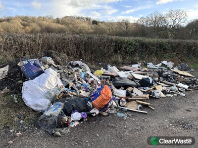 General household waste dumped on lane . Wood , toys and bags of rubbish