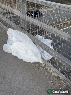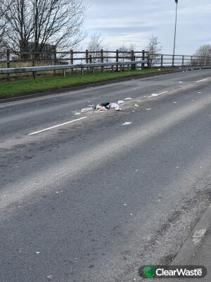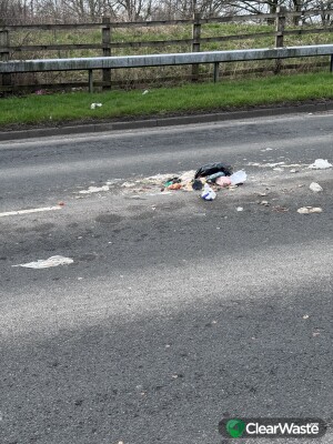 Waste dumped in middle of road with debris blowing onto motorway