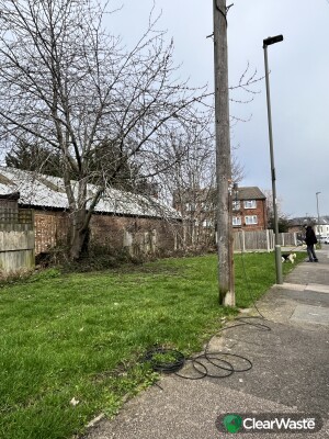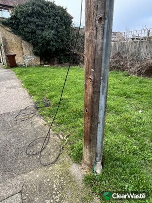 Hanging loose wires off a post which stretch out over the pavement this is very dangerous and a health and safety issue