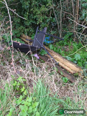 Old garden chair and timber and black bags of rubbish thrown in ditch opposite the allotments