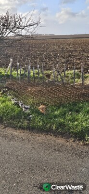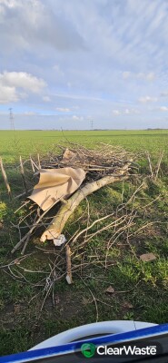 Old spring mattress on left hand side and further down brown paper and large cuttings of trees and branches.