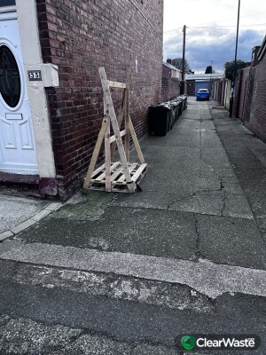 Extra large pallet dumped at entrance to alleyway by builders from no.46