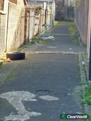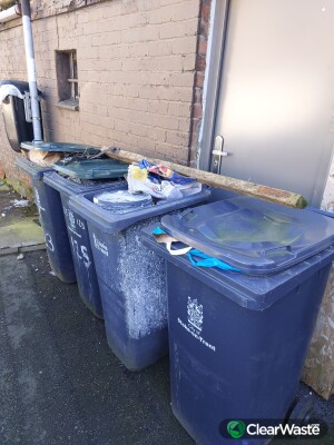 4 bind full of building debris and animal excrement. Asda trolley and tyre. Bins have been there over a month, bin men rightfully not emptying them. They are very ,very heavy . Seems to be the norm round here now , as what started as 1 bin is now 4.