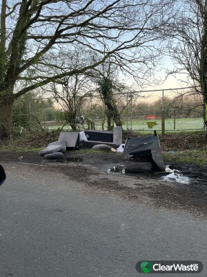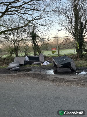 A Sofa has been dumped in pieces at the side of the road. Along with potentially some other rubbish. Ruining a perfectly nice road