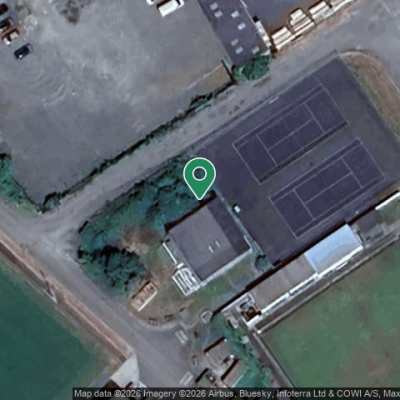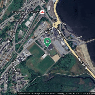 Near the Phoenix Centre tennis court/bowls, by the Fishguard Squash Club - tin building.
