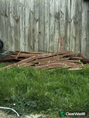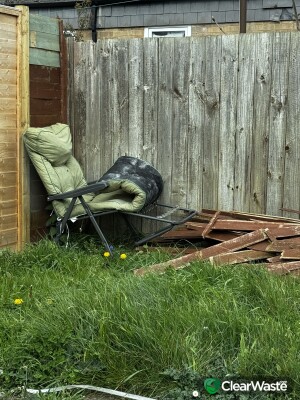 Garden lounge chair and a pile of wood.