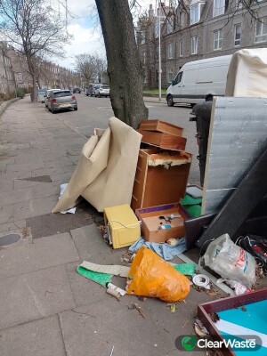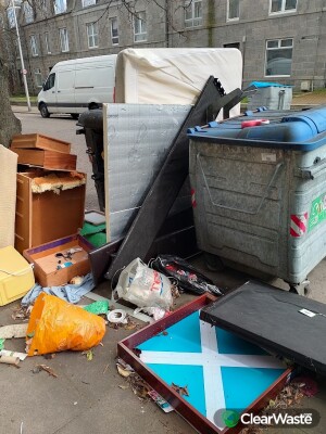 The fly-tipping consists of a yellow microwave, several pieces of broken wooden furniture (drawers and frames), large rolls of carpet or underlay, insulation panels, and various plastic bags containing general household waste.