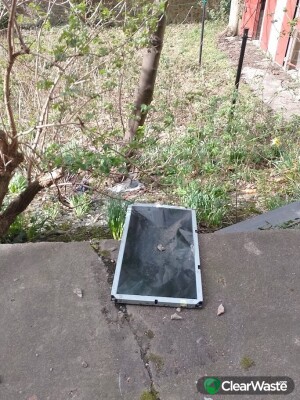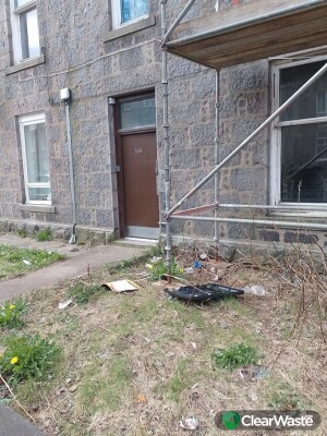 Fly-tipping at 114 Walker Road. Discarded plastic debris, paper, and general litter on the grass outside the main entrance.