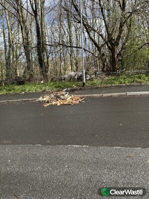 Rubbish left all over some wood left on road as well car seats rubbish all over