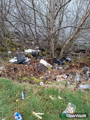 Follow river pattack along the A86, its in the first layby on the left when you get to loch laggan. Tyres, wheels, office chairs, rubble, foot amd drink rubbish, etc.